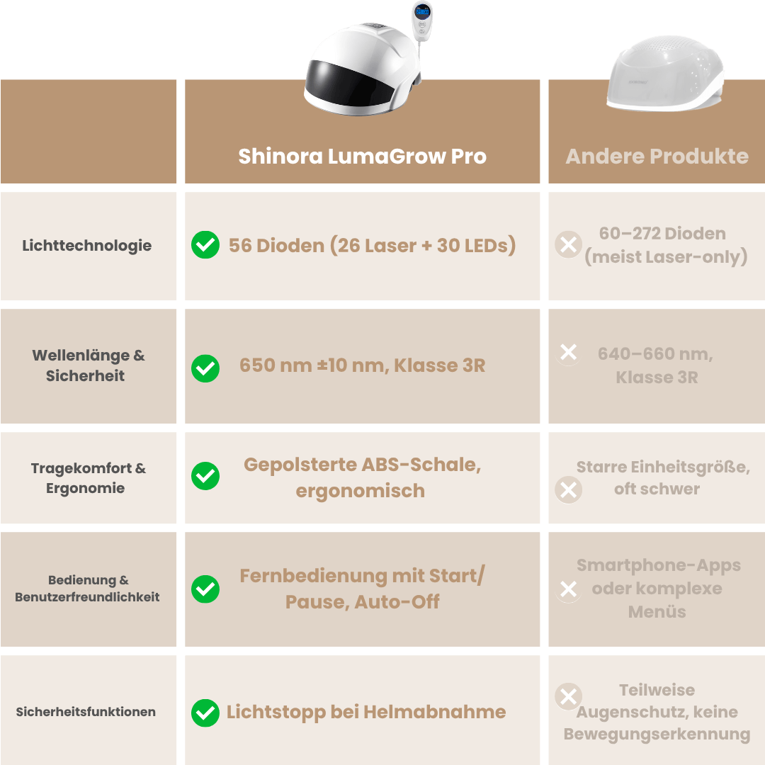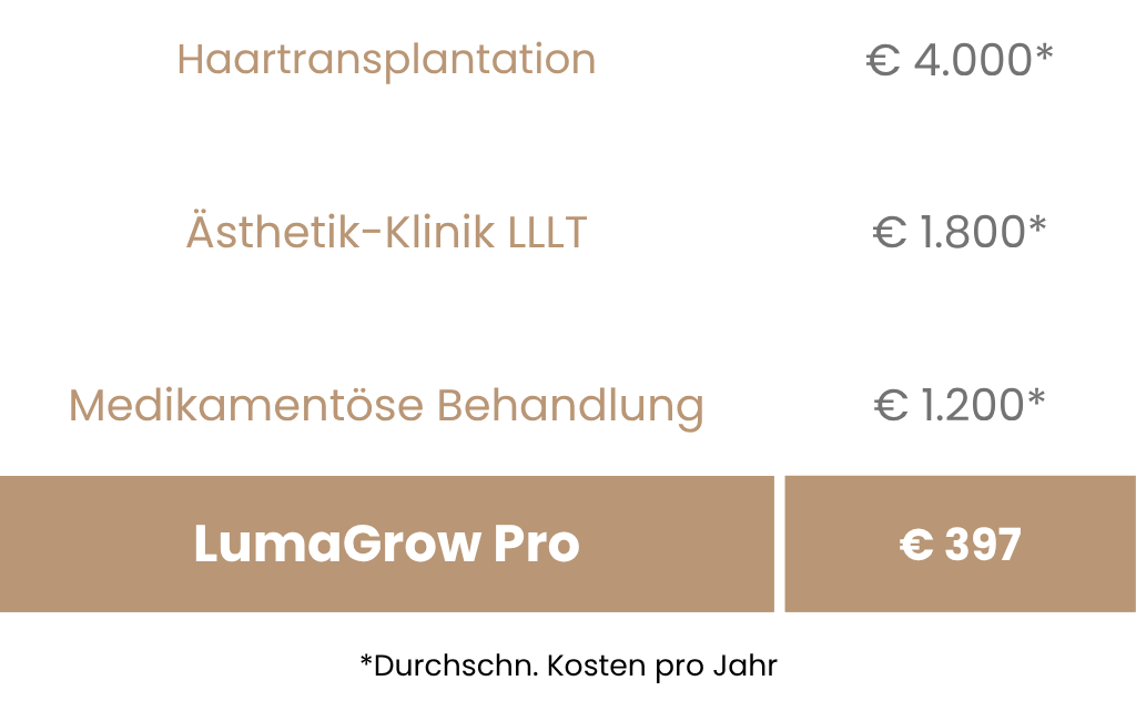 • Warum jeden Monat Hunderte Euro für Klinikbesuche oder Medikamente ausgeben, wenn du mit dem LumaGrow Pro bequem zu Hause starten kannst? Er unterstützt dein Haarwachstum – und das zu einem Bruchteil der Kosten vergleichbarer Methoden.